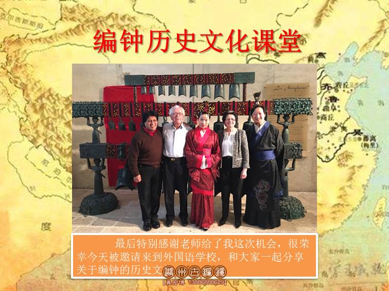 序:同學(xué)們,大家好!我是編鐘文化傳承人龔宏博,從我的父輩起就開始從事編鐘的復(fù)仿制工作,如今已有快30年了,感謝謝老師給了我這次機(jī)會,很榮幸今天被邀請來到 學(xué)校,和大家一起分享關(guān)于編鐘的歷史文化。