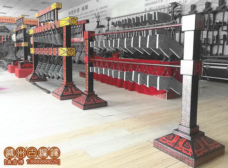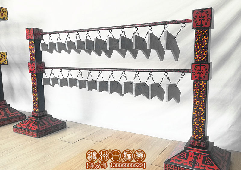 公司復(fù)原制作的24音編磬全長(zhǎng)1.8米,寬50厘米,高1.1米;演奏方便,音色亮麗,公司設(shè)計(jì)了編磬木桌放置編磬,長(zhǎng)2米,高70厘米,寬60厘米,陳列編磬后總高度:1.8米。木桌內(nèi)做儲(chǔ)藏柜,可方便樂隊(duì)保管其他樂器及服裝,方便實(shí)用。